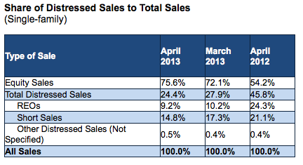 The April pending and distressed sales report from the California Association of Realtors revealed that the combined share of distressed properties (short sales and foreclosures) fell to 24.4%, down from 27.9% in March and 45.8% a year earlier.